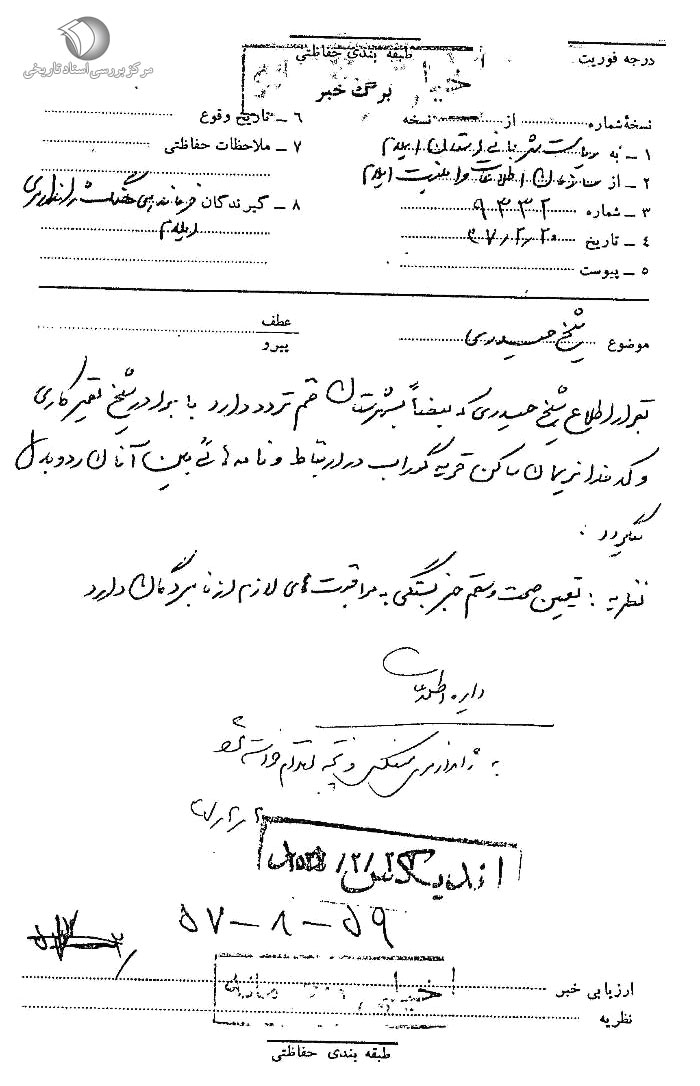 ١٥. مرکز بررسی اسناد تاریخی (۱۳۹۱)، یاران امام به روایت اسناد ساواک: آیتالله شیخ عبدالرحمن حیدری، ناشر: مرکز بررسی اسناد تاریخی، تهران.