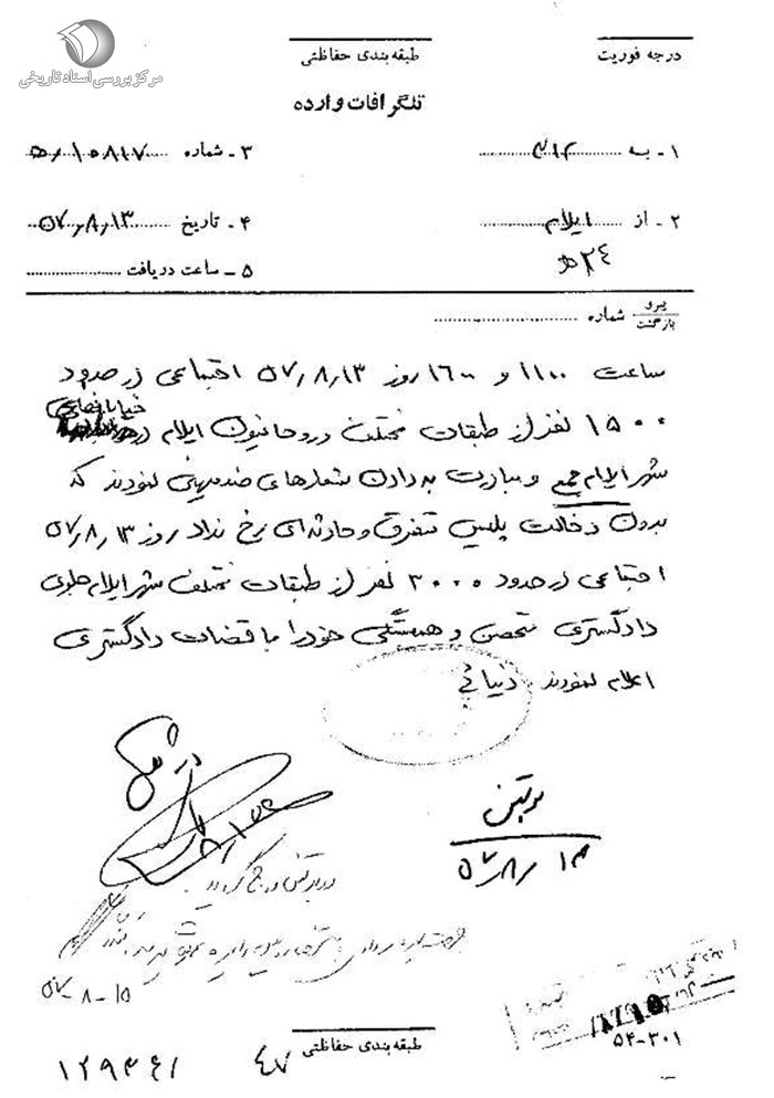 برخی اسناد مجموعه انقلاب اسلامی به روایت اسناد ساواک (١٣٥٧-١٣٥٦خ)، مرکز بررسی اسناد تاریخی نیز به رویدادها و حوادث انقلاب در استان ایلام مربوط هستند. این رویدادها دارای آن درجه از اهمیت بودهاند که اخبار آنها در این مجموعه آمده است. از جمله این رویدادها میتوان به حوادث روز عید فطر ۱۳۹۸ق/۱۳ شهریور ۱۳۵۷ در شهر ایلام اشاره کرد. تعطیلی و اعتصاب مدارس، مراکز آموزشی و دانشکده دامپروری ایلام، ادارات، بازار، اعتراضات، تظاهرات و راهپیماییهای مردمی در این گزارشها ثبت شده است. برخی از این گزارشها و اخبار سال ۱۳۵۷ در بولتنهای ساواک و گزارشهای نوبهای فرمانداری نظامی بازتاب یافتهاند.
