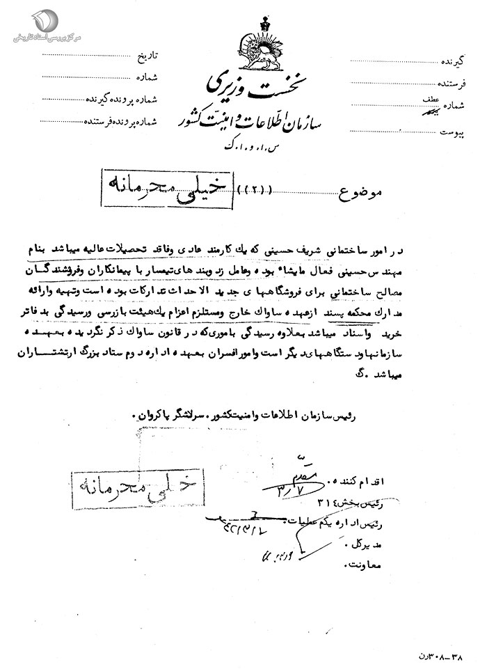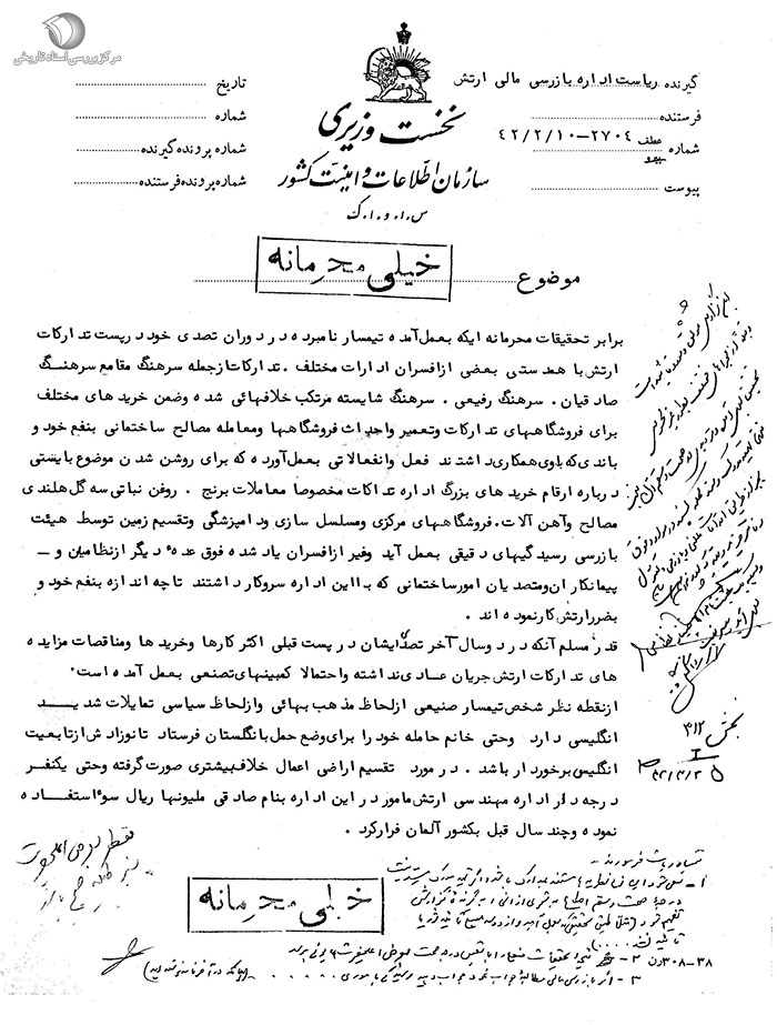 به عرض برسد در صورت تصویب مفاد این گزارش در پاسخ تقاضای بازرسی مالی ارتش به آن بازرسی ارسال گردد. 2 / 3 / 42 به علاوه اضافه کنید که رسیدگی به اموری که در قانون ساواک ذکر نگردیده به عهده سازمانها و دستگاههای دیگر است و امور افسران به عهده اداره دوم ستاد بزرگ ارتشتاران میباشد