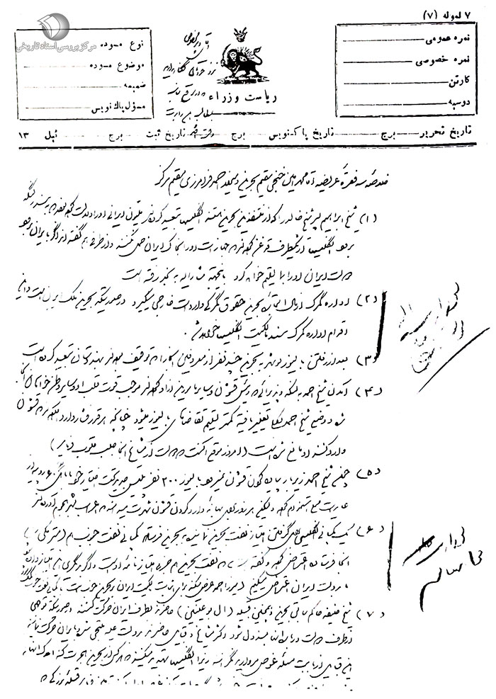 (2) اداره گمرک از مالالتجاره بحرین حقوق گمرکی واردات خارجی میگیرد در صورتیکه بحرین ملک ایران است و این اقدام اداره گمرک سند مالکیت انگلیسها خواهد شد.