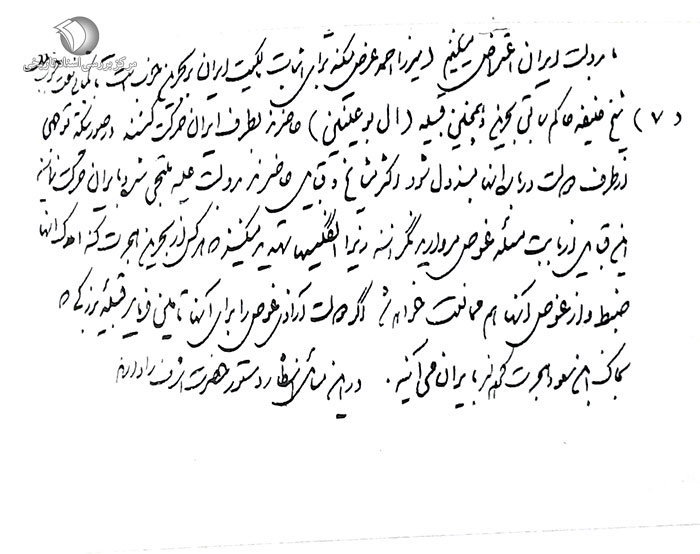 (7) شیخ خلیفه حاکم سابق بحرین و همچنین قبیله (آل بوعینین) حاضرند به طرف ایران حرکت کنند. در صورتی که توجهی از طرف دولت درباره آنها مبذول شود، اکثر مشایخ و قبایل حاضرند به دولت علّیه ملتجی شده و به ایران حرکت نمایند. این قبایل از بابت مسئله غوص مروارید نگرانند زیرا انگلیسها تهدید میکنند که هر کس از بحرین هجرت کند املاک آنها ضبط و از غوص آنها هم ممانعت خواهد شد. اگر دولت آزادی غوص را برای آنها تأمین فرماید قبیله بزرگی که به خاک ابنسعود هجرت کردهاند به ایران میآیند. در این مسائل انتظار دستور حضرت اشرف را دارند.