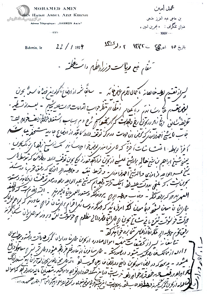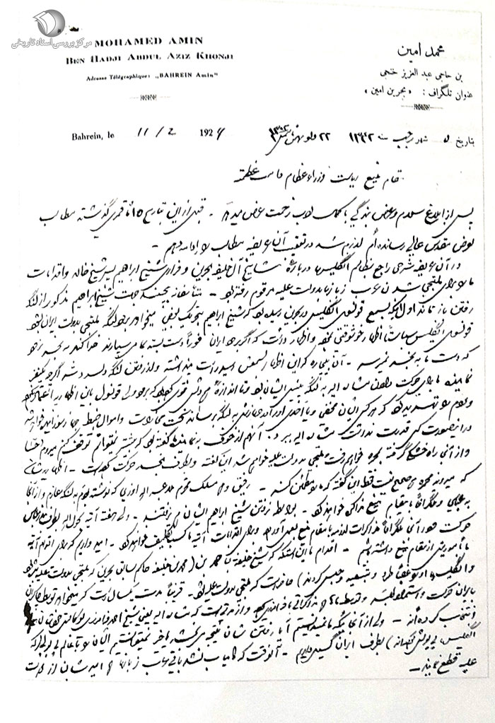 جناب آقا شیخ احمد فرامرزی که محض این مهمات در مرکز توقف دارد کاملاً از اوضاع جاریه مستحضر میباشد. اخیراً به واسطه اغتشاشات اخیره که آقای فرامرزی به عرض خواهد رسانید یک از شیخزادههای بزرگ بحرین یعنی شیخ ابراهیم بن شیخ خالد برادر شیخ عیسی از بحرین فرار کرده و در نزدیکی بحرین توقف دارد و حاضر شده که توسط آقای شیخ عبدالواحد فرامرزی والد شیخ احمد فرامرزی و توسط بنده و ملاعبدالله اوزیی که رفیق محترم ما در مسئله بحرین است که ملتجی به دولت علّیه شود. اینک قرار دادهایم که شیخ عبدالواحد برود در محل توقفشان و کاملاً دستورالعمل بدهد که برود لنگه. و جناب ملاعبدالله هم بروند لنگه دستورالعمل به ایشان میدهند. البته لازم است که وظیفه برای ایشان معین بشود و به مأمورین لنگه امر فرمائید که همهگونه وسائل احترام برایشان فراهم بیاورند که به مراحم اولیای دولت خوشوقت شده و باقی مشایخ بحرین هم برای التجاء حاضر و اهالی مظلوم هم خوشوقت شده و بروند سواحل ایران سکنا بگیرند. رفیق محترم ملاعبدالله تلگرافاً از عباس مخابره خواهند کرد.