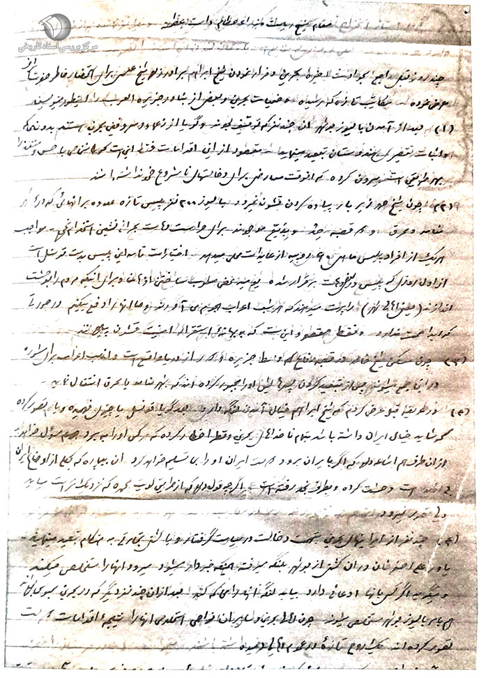 (3) در عریضه قبل عرض کردم که شیخابراهیم خیال آمدن لنگه دارد. بعد گویا قونسل یا چیزی فهمیده و یا تصور کرده که شاید خیال ایران داشته باشد به تمام ناخداهای بحرین و قطر اخطار کرده که هر کس او را ببرد مسئول خواهد شد. از آن طرف هم اشاعه داده که اگر به ایران برود و دولت ایران او را به ما تسلیم خواهد کرد. آن بیچاره که به کلی از اوضاع ایران بیاطلاع است وحشت کرده و به طرف نجد رفته است. اگر چه قول داده که از طریق کویت به محمره که نزدیکتر است میآید ولی تصور نمیرود.
