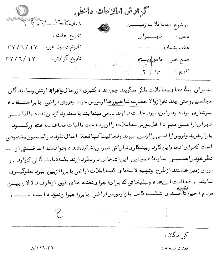 مدیران بنگاههای معاملات ملکی میگویند چون عده کثیری از رجال و امرای ارتش و نمایندگان مجلسین و حتی چند نفر از والاحضرت شاهپورها از بورس خرید و فروش اراضی بایر استفاده سرشاری برده و در این امور دخالت دارند، سعی مینمایند با محدود کردن نقشه مالیاتی تهران اراضی مهم داخل بورس معاملات را از پرداخت مالیات معاف ساخته و رکود بازار خرید و فروش اراضی را از بین ببرند و فعالیت آنها فعلاً اعمال نفوذ در کمیسیون مخصوصی است که برای انجام کار در پیشکاری دارایی تهران تشکیل شده و توانستهاند قسمتی از نظر خود را عملی سازند و همچنین این اشخاص در نظر دارند به کمک نمایندگانی که وارد در بورس زمین هستند از طرح و تهیه لایحهای که معاملات اراضی بایر را از بین ببرد جلوگیری نمایند. فعالیت این عده و تبلیغاتی که برای اجرای نقشههای فوق از طرف دلالان بین مردم اخیراً تا حدی شکست کامل بازار بورس اراضی بایر را جبران نموده است.