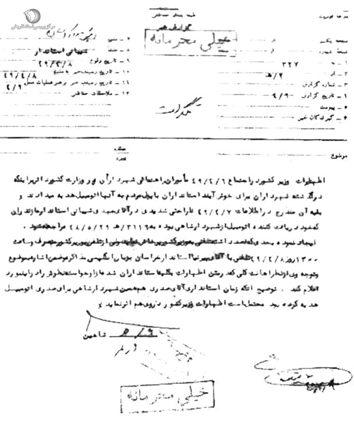 اظهارات وزیر کشور در اجتماع 6 /4 /49 مأموران راهنمائی شهرداران در وزارت کشور دائر بر این که در گذشته شهرداران برای خوش آیند استانداران با پول مردم به آنها اتومبیل هدیه میدادند و بقیه آن، مندرج در اطلاعات 7 /4 /49، ناراحتی شدیدی در آقای مهدی شیبانی استاندار مازندران که خود دریافت کننده اتومبیل از شهردار شاهی بوده – به[نامه] 3616/ه 29 /5 /48 مراجعه شود - ایجاد نموده به حدی که قصد داشته تلفنی به وزیر کشور پرخاش نماید ولی از تلفن به وزیر کشور منصرف و ساعت 13:00 روز 8 /4 /49 تلفنی با آقای پیرنیا استاندار خراسان به زبان انگلیسی مذاکره و ضمن اشاره به موضوع و توجه وی از نظر اهانت کلی که در متن اظهارات به کلیه استانداران شده از او خواسته نظرش را در این مورد اعلام کند. توضیح آن که زمان استانداری آقای صدری هم همین شهردار شاهی برای صدری اتومبیل هدیه کرده بود. محتمل است اظهارات وزیر کشور در وی هم اثر نماید. شاهین