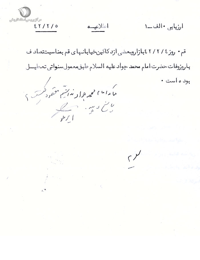 قم. روز 4 / 2 / 42 بازار و بعضی از دکاکین خیابانهای قم به مناسبت تصادف با روز وفات حضرت امام محمدجواد علیهالسلام طبق معمول سنواتی تعطیل بوده است.