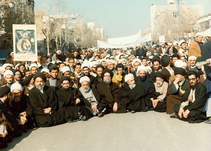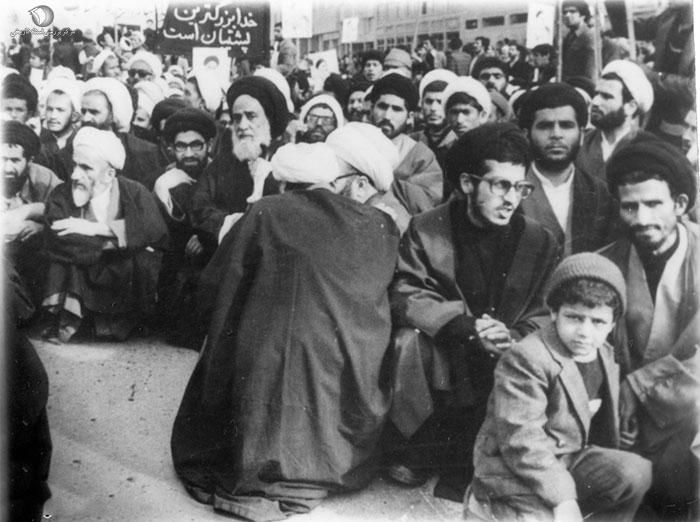 1357. یکی از راهپیماییهای انقلاب در شهر مشهد. در تصویر آیات و حجج اسلام سیدعزالدین زنجانی، میرزا علی فلسفی ، سیدمحمدعلی میلانی و محمدمهدی نوغانی دیده میشوند.