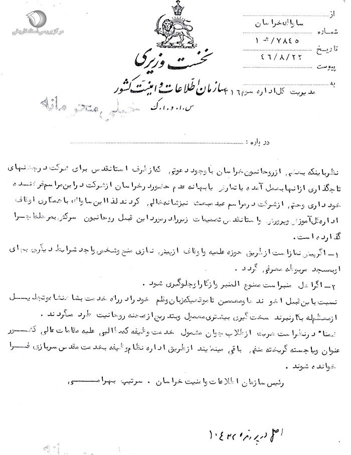 نظر به اینکه بعضی از روحانیون خراسان با وجود دعوتی که از طرف آستان قدس برای شرکت در جشنهای تاجگذاری [4 آبان 1346] از آنها به عمل آمده با تمارض یا بهانه عدم حضور در خراسان از شرکت در این مراسم فرخنده خودداری و حتی از شرکت در مراسم عید مبعث [27 رجب 1387ق مطابق با 10 آبان 1346] نیز شانه خالی کردند، لذا این ساواک با همکاری اوقاف، اداره آموزش و پرورش و آستان قدس تصمیمات زیر را در مورد این قبیل روحانیون سرکش به مرحله اجرا گذارده است: