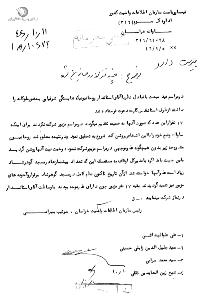 17 نفر از این عده که صورت آنها به ضمیمه تقدیم میگردد، در مراسم مزبور شرکت نکردند. برای اینکه ساواک وضع خود را با این اشخاص روشن کند، شروع به تحقیق نمود و در نتیجه معلوم شد روحانیون مشروحه زیر بدون هیچگونه عذر موجهی در مراسم مزبور شرکت ننموده و خبث نیت آنها روشن گردید. به این جهت با مذاکره با مدیرکل اوقاف به مستمسک اینکه تعداد پیشنمازها در مسجد گوهرشاد زیاد است عذر آنها خواسته شد. از آن تاریخ تاکنون نظم کامل در مسجد گوهرشاد برقرار و آخوندهای مزبور نیز تنبیه گردیدند. بقیه 17 نفر مزبور چون دارای عذر موجه بودند با وساطت آقای استاندار در نماز شرکت مینمایند.[1]