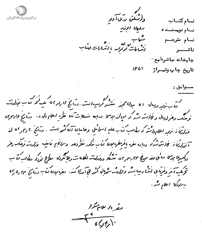 کتاب مزبور در سال 51 بدون مجوز منتشر گردیده است. در تاریخ 12 / 1 / 52 یک نسخه کتاب به وزارت فرهنگ و هنر ارسال و خواسته شد که پس از بررسی درباره مندرجات آن نظریه اعلام دارد. در تاریخ 16 / 3 / 52 وزارتخانه مزبور اعلام داشته که مطالب کتاب علیه اسرائیل و حامیان آن کشور است. در تاریخ 20 / 3 / 52 از آن وزارتخانه خواسته شد که درباره مضره و یا غیر مضره بودن کتاب مذکور نظر دهد و سرانجام نماینده وزارت فرهنگ و هنر در کمیسیون بررسی مسایل روز مورخ 23 / 3 / 52 متشکله در وزارت اطلاعات و جهانگردی مطرح نمود که مطالب کتاب تحریکآمیز و غیرقابل انتشار میباشد و قرار شد شهربانی کشور جمعآوری کند. مضره بودن کتاب در تاریخ 23 / 5 / 52 به ساواکها اعلام شد.