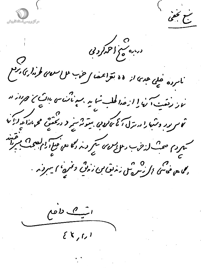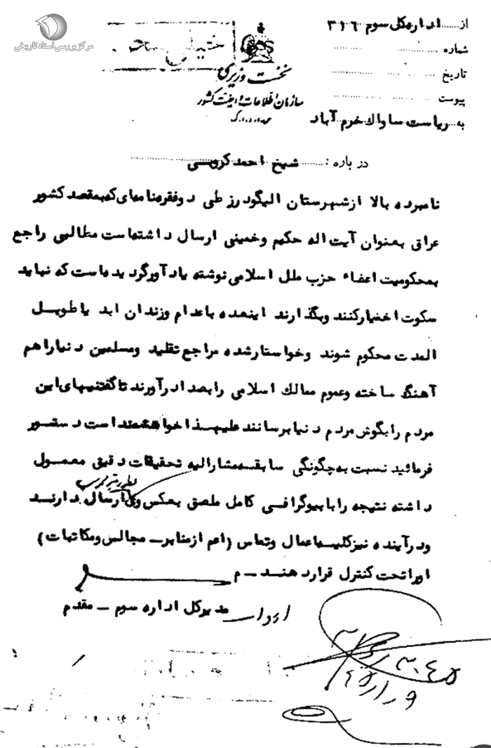 نامبرده بالا]شیخ احمد کروبی[ از شهرستان الیگودرز طی دو فقره نامهای که به مقصد کشور عراق به عنوان آیتاله حکیم و خمینی ارسال داشته است مطالبی راجع به محکومیت اعضاء حزب ملل اسلامی نوشته یادآور گردیده است که نباید سکوت اختیار کنند بگذارند این عده به اعدام و زندان ابد یا طویل المدت محکوم شوند و خواستار شده مراجع تقلید و مسلمین دنیا را هم آهنگ ساخته و عموم ممالک اسلامی را به صدا درآورند تا گفتنیهای این مردم را به گوش مردم دنیا برسانند...»[30]