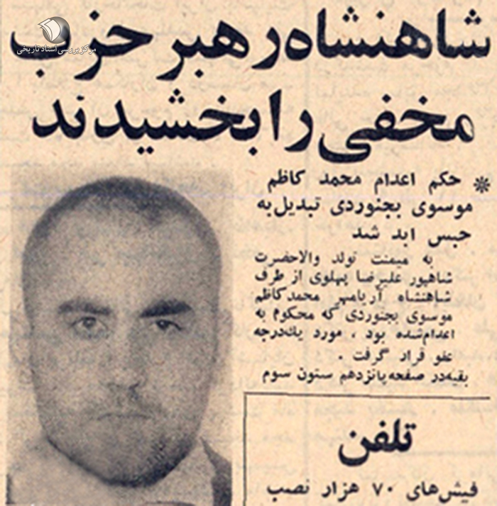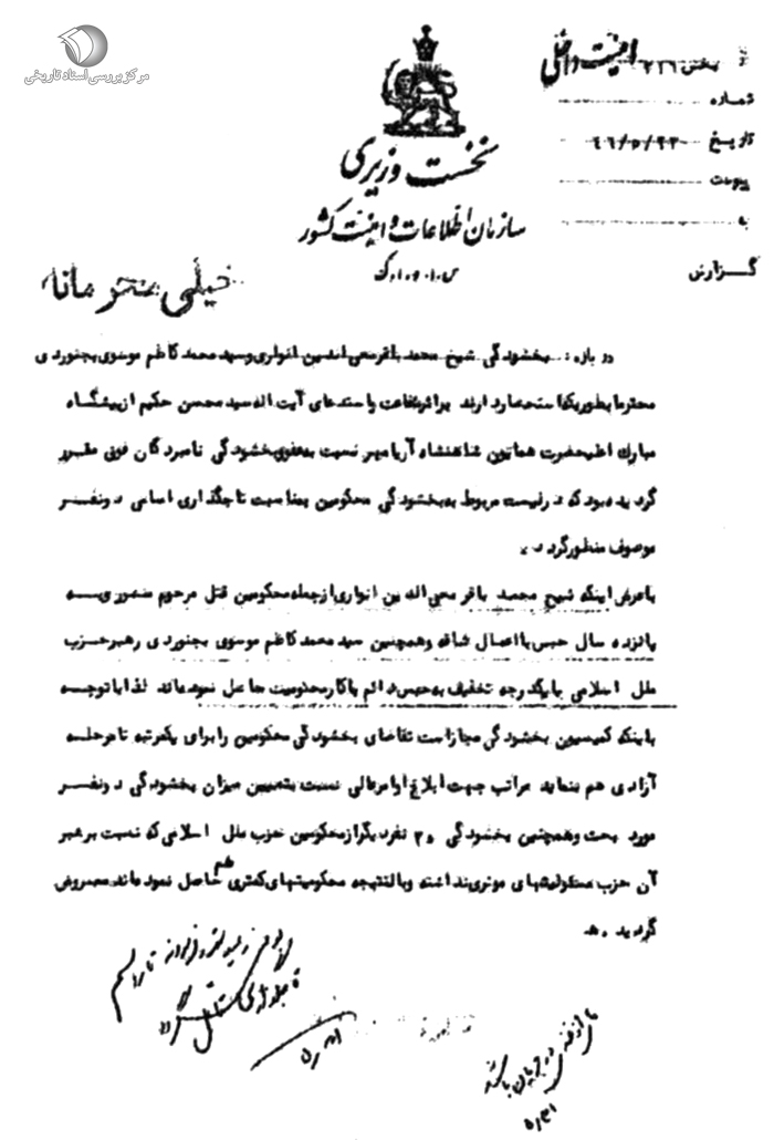 «... محترماً به طوری که استحضار دارند بر اثر شفاعت و استدعای آیتاله سیدمحسن حکیم از پیشگاه مبارک اعلیحضرت همایون شاهنشاه آریامهر نسبت به عفو و بخشودگی نامبردگان فوق مقرر گردیده بود که در لیست مربوط به بخشودگی محکومین به مناسبت تاجگذاری اسامی دو نفر موصوف منظور گردد. با عرض اینکه شیخ محمدباقر محیالدین انواری از جمله محکومین قتل مرحوم منصور و به پانزده سال حبس با اعمال شاقه و همچنین سیدمحمدکاظم موسوی بجنوردی رهبر حزب ملل اسلامی با یک درجه تخفیف به حبس دائم با کار محکومیت حاصل نمودهاند لذا با توجه به اینکه کمیسیون بخشودگی مجاز است تقاضای بخشودگی محکومین را برای یک مرتبه تا مرحله آزادی هم بنماید مراتب جهت ابلاغ اوامر عالی نسبت به تعیین میزان بخشودگی دو نفر مورد بحث و همچنین بخشودگی 35 نفر دیگر از محکومین حزب ملل اسلامی که نسبت به رهبر آن حزب مسئولیتهای مؤثری نداشته و بالنتیجه محکومیتهای کمتری هم حاصل نمودهاند معروض گردید. به عرض رسید مقرر فرمودند تا مراسم تاجگذاری تأمل گردد.»[28]