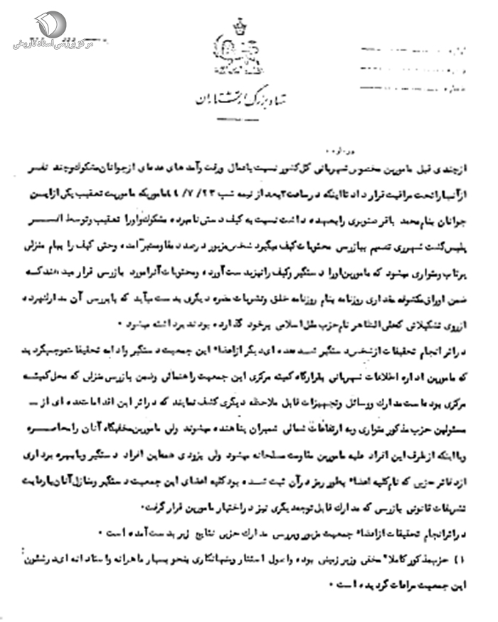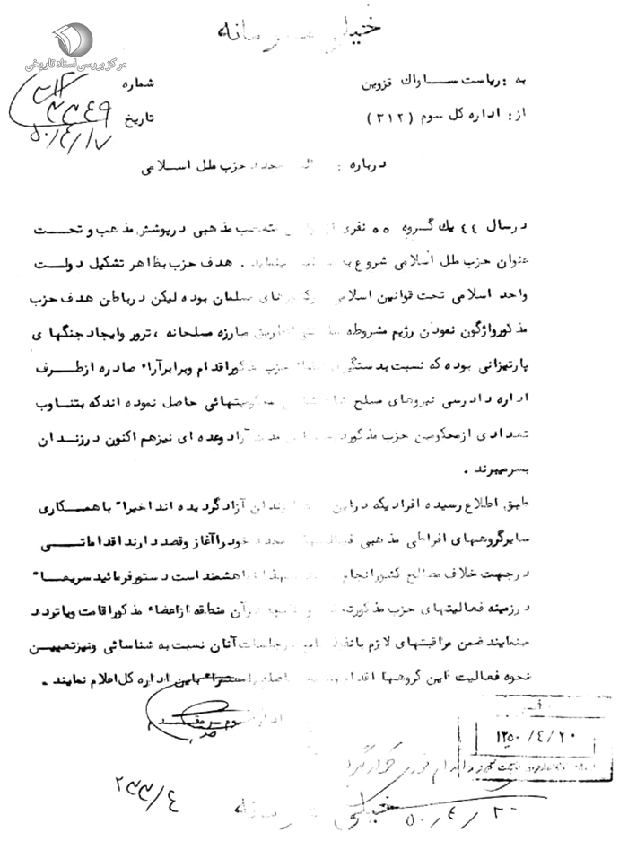 5- ضمن مدارک حزبی مکشوفه دستورات صریحی دائر به برداشت (سرقت) اسلحه و مهمات و سایر وسایل از اماکن دولتی به اعضاء داده شده بود و این عمل را از نظر شریعت مقدس اسلام جایز قلمداد نموده بودند کما اینکه یکی از اعضاء حزب در پیرو این دستور حزبی یک دستگاه ضبط صوت از منزل خویش سرقت و به حزب هدیه نموده است.