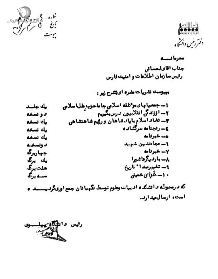 [37] .شمس، اسماعیل، همان، ص شش؛ هر چند که از اوایل دهه 40 شمسی اعضای حزب ملل اسلامی دستگیر و راهی زندان شدند، اما تا سالهای پایانی عمر پهلوی نیز از پخش منشورات مربوط به حزب ملل در برخی از مراکز دانشگاهی از جمله دانشگاه پهلوی شیراز اخباری به گوش میرسید و در اسناد بدان اشاره شده است. (سند شماره 11 از مجموعه حاضر).