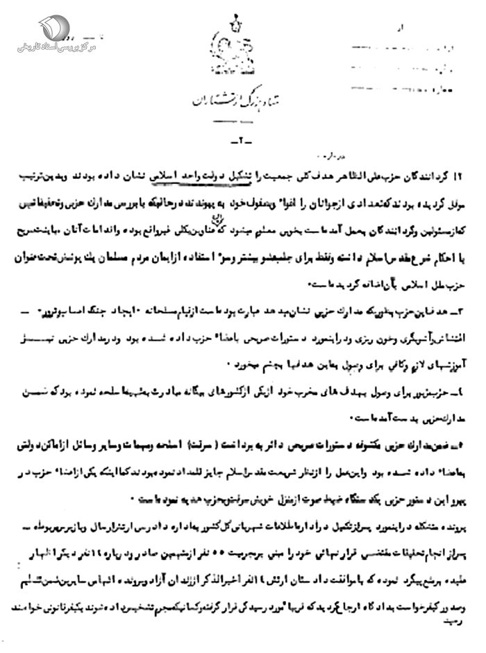 2- گردانندگان حزب علیالظاهر هدف کلی جمعیت را تشکیل دولت واحد اسلامی نشان داده بودند و بدینترتیب موفق گردیده بودند که تعدادی از جوانان را اغواء و به صفوف خود بپیوندند، در حالی که با بررسی مدارک حزبی و تحقیقاتی که از مسئولین و گردانندگان بهعمل آمده است به خوبی معلوم میشود که این عناوین به کلی غیر واقع بوده و اقدامات آنان مباینت صریح با احکام شرع مقدس اسلام داشته و فقط برای جلب عضو بیشتر و سوءاستفاده از ایمان مردم مسلمان یک پوشش تحت عنوان حزب ملل اسلامی به آن اضافه گردیده است.