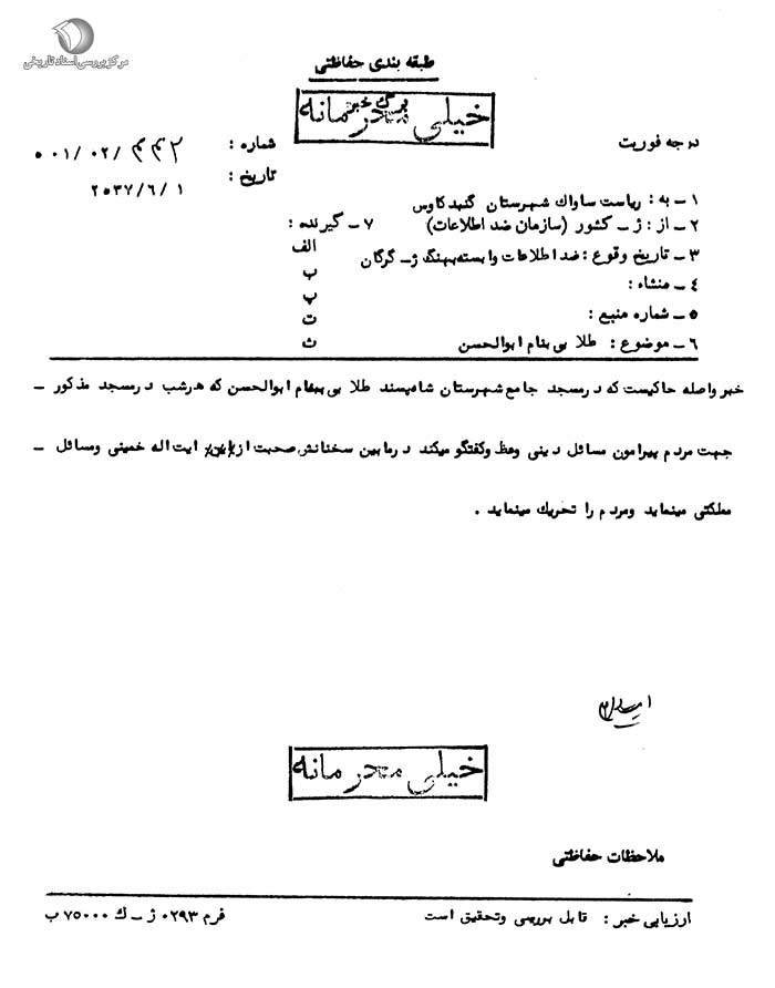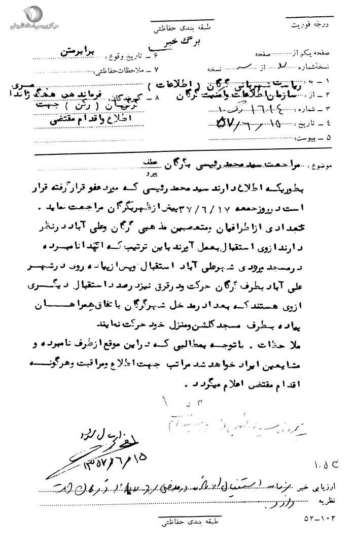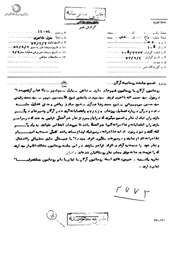 «ساعت 14 روز جاری حدود 50 نفر از متعصبین مذهبی مسجد الهیان واقع در خیابان ملل گرگان ضمن فرستادن صلوات و شعارهایی به نفع خمینی داده که با دخالت مأمورین شهربانی متفرق شدند. مراقبت توسط شهربانی ادامه دارد.»[6]