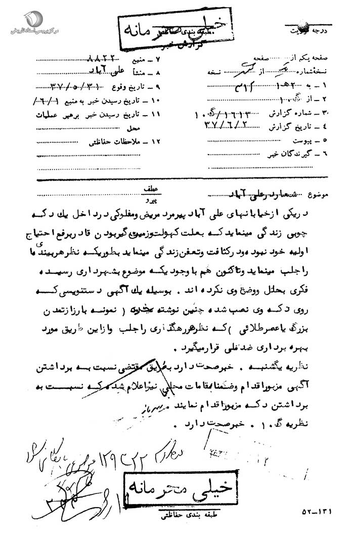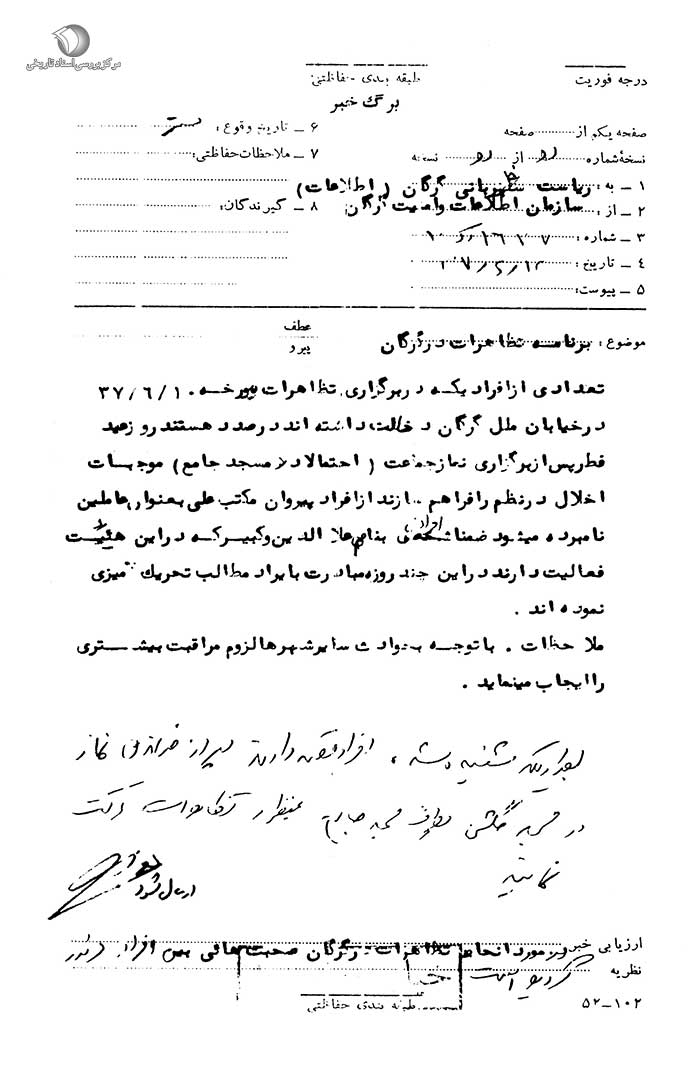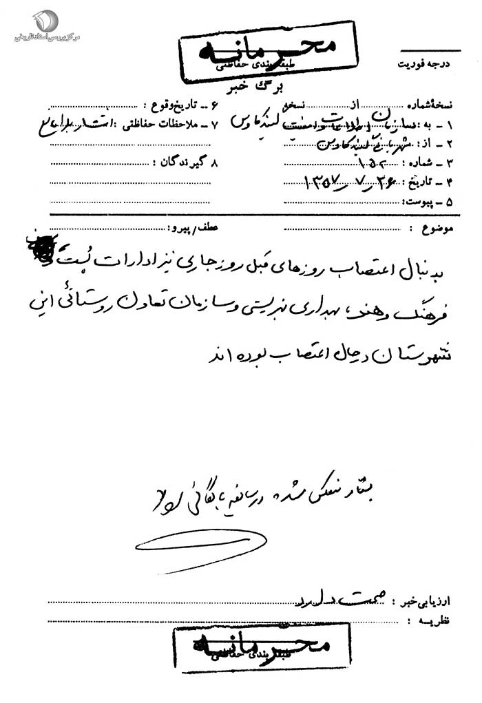 «شب گذشته نمونه اعلامیههای مضرهای به پیوست تقدیم است در نقاط مختلف شهر پخش و در چند نقطه نیز زیر برفپاککن اتومبیلهایی که در حال پارک بودهاند گذاشته شده است اقدام لازم به منظور شناسایی عاملین بهعملآمده.»[23]