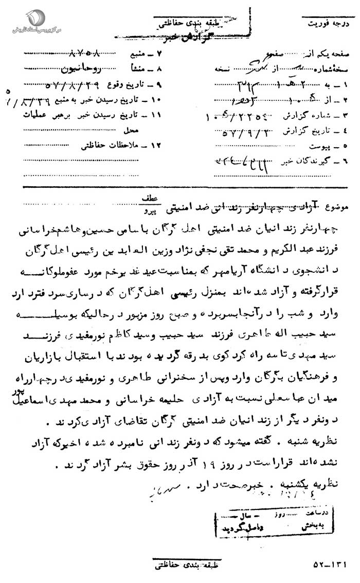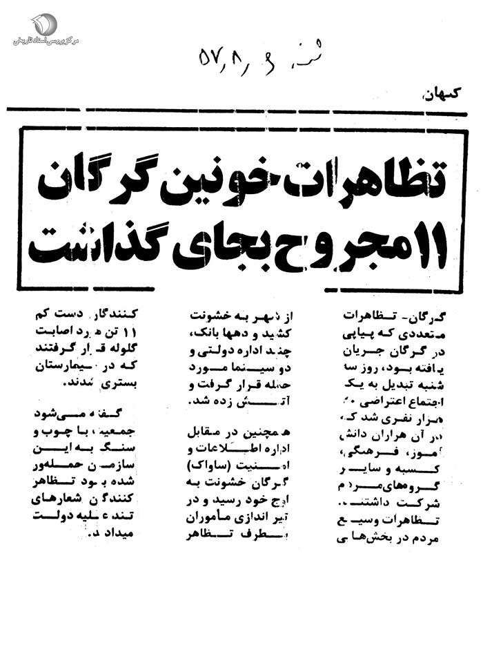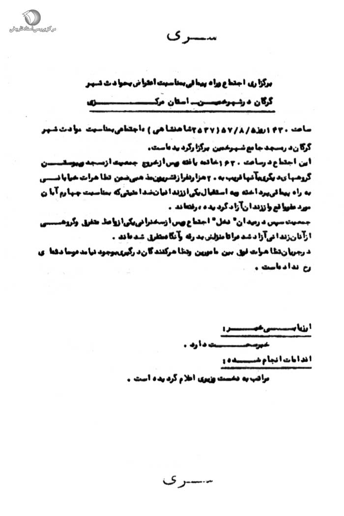 «برابر گزارش گروهان گرگان مستند به اعلام پاسگاه علیآباد صبح روز جاری قریب دو هزار نفر از دانشآموزان مدارس علیآباد ضمن تعطیل نمودن مدارس مبادرت به تظاهرات خیابانی و دادن شعارهای ضد ملی نموده و عدهای قریب 300 نفر از تظاهرکنندگان در چهارراه جنگلده مبادرت به آتشافروزی نمودهاند که مأمورین بهناچار با پرتاب یک عدد نارنجک اشکآور تظاهرکنندگان را متفرق کردهاند ولی در خیابانهای دربند ـ قصر و اطراف دانشسرا تظاهرات همچنان ادامه دارد. لذا مراتب ذیل همین شماره به ساواک گرگان و ضد اطلاعات وابسته اعلام و به گروهان گرگان دستور داده شد ضمن مراقبت لازم هرگونه رویدادی را بلافاصله گزارش نمایند که مراتب جهت استحضار به عرض میرسد.»[28]