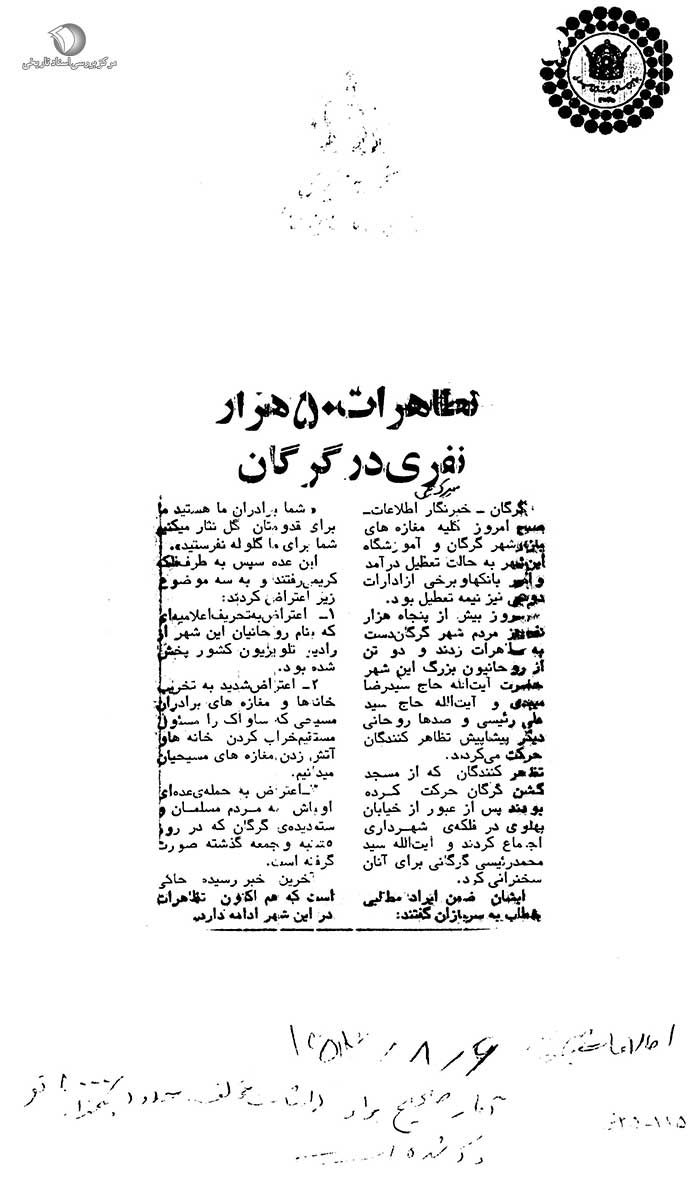 3ـ کلاسهای مدرسه عالی منابع طبیعی گرگان به علت اعتصاب استادان همچنان تعطیل است. ضمناً حدود 100 نفر از دانشجویان دانشسرای راهنمایی تحصیلی در بعدازظهر روز گذشته در سالن نمایشات[نمایشها] خواستههایی از قبیل برقراری حکومت اسلامی و آزادی زندانیان سیاسی را خواستهاند.»[20]