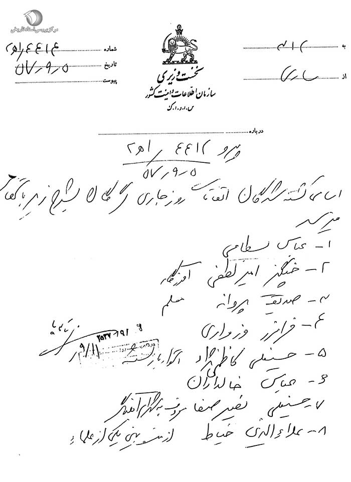 علیهذا با شرح مطالب معروضه برحسب وظیفهای که به عهده دارم استدعا مینمایم اجازه فرمایید صورت اسامی تعدادی از سردستگان و گردانندگان تظاهرات که البته از طریق ساواک بهطور غیر محسوس در اطراف صحت و سقم اسامی زیر تقدیم میشود بررسی خواهد شد. از این منطقه تبعید و یا مدتی نسبت به بازداشت نمودن آنان اقدام نموده تا از بروز هرگونه حوادثی ناگوار که دارای عواقبی وخیم خواهد بود جلوگیری شود.»[27]