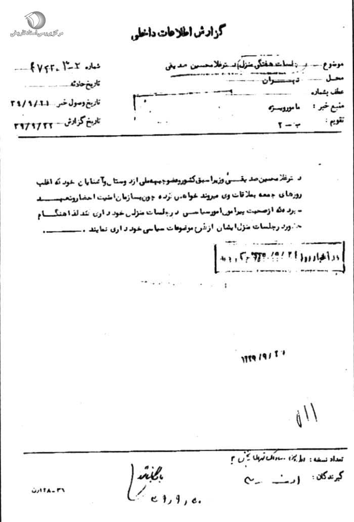 دکتر غلامحسین صدیقی وزیر اسبق کشور و عضو جبهه ملی از دوستان و آشنایان خود که اغلب روزهای جمعه به ملاقات وی میروند خواهش کرده چون به سازمان امنیت احضار و تعهد سپرده که از صحبت پیرامون امور سیاسی در جلسات منزلش خودداری کند، لذا هنگام حضور در جلسات منزل ایشان از طرح موضوعات سیاسی خودداری نمایند.»[13]