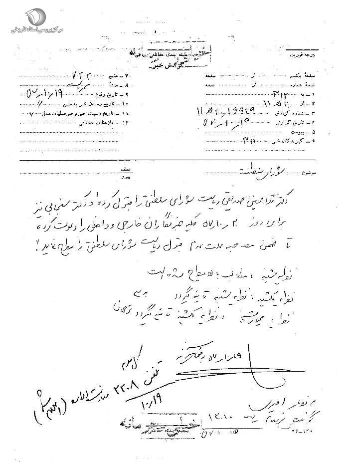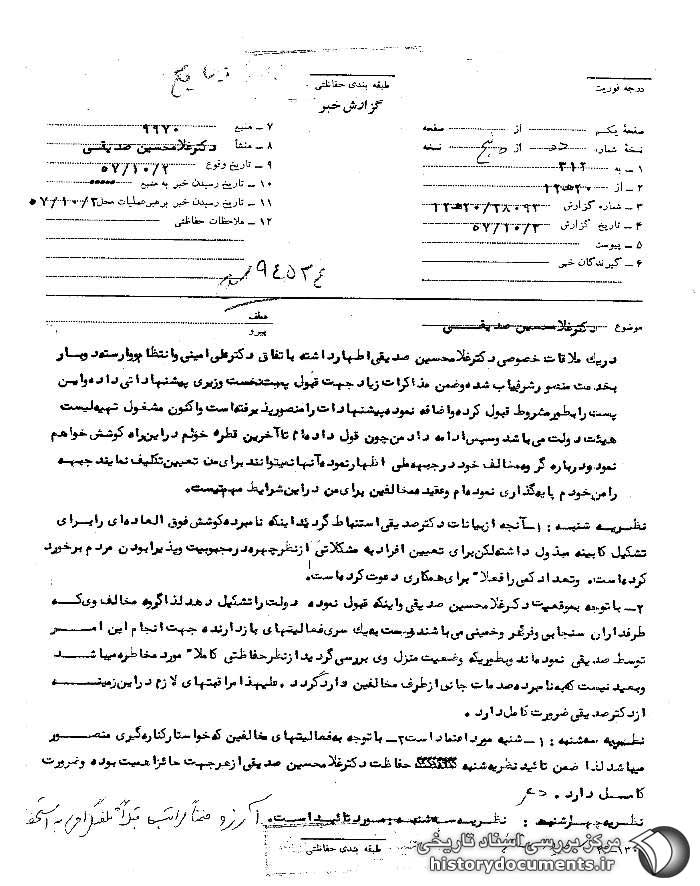 در سندی به تاریخ 2 دی ماه با طبقهبندی حفاظتی درباره مذاکرات شاه و صدیقی درباره پست نخستوزیری آمده است:
