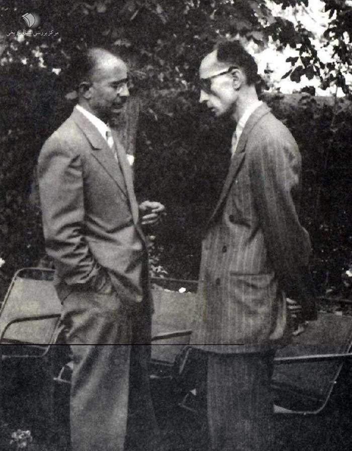 دکتر غلامحسین صدیقی در کنار دکتر حسین فاطمی (وزیر امور خارجه دولت مصدق)