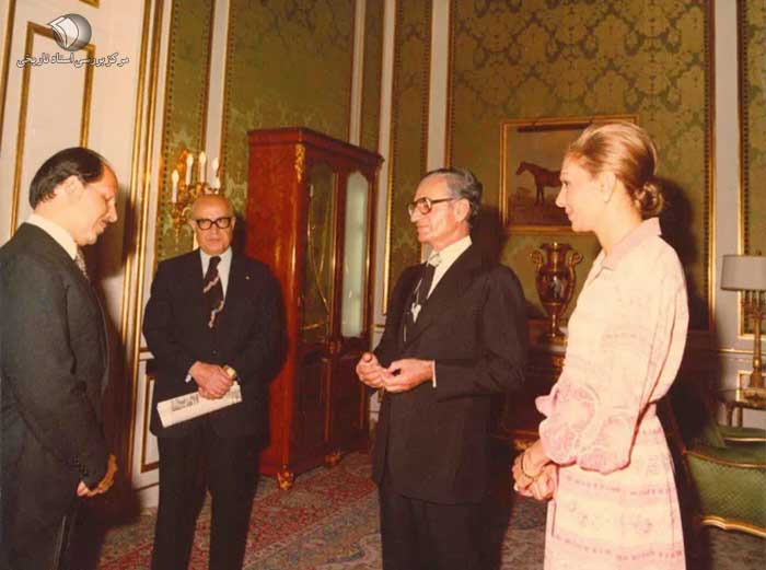 از راست فرح پهلوی، محمدرضا شاه، جعفر شریفامامی و سید حسین نصر در سال 1357.