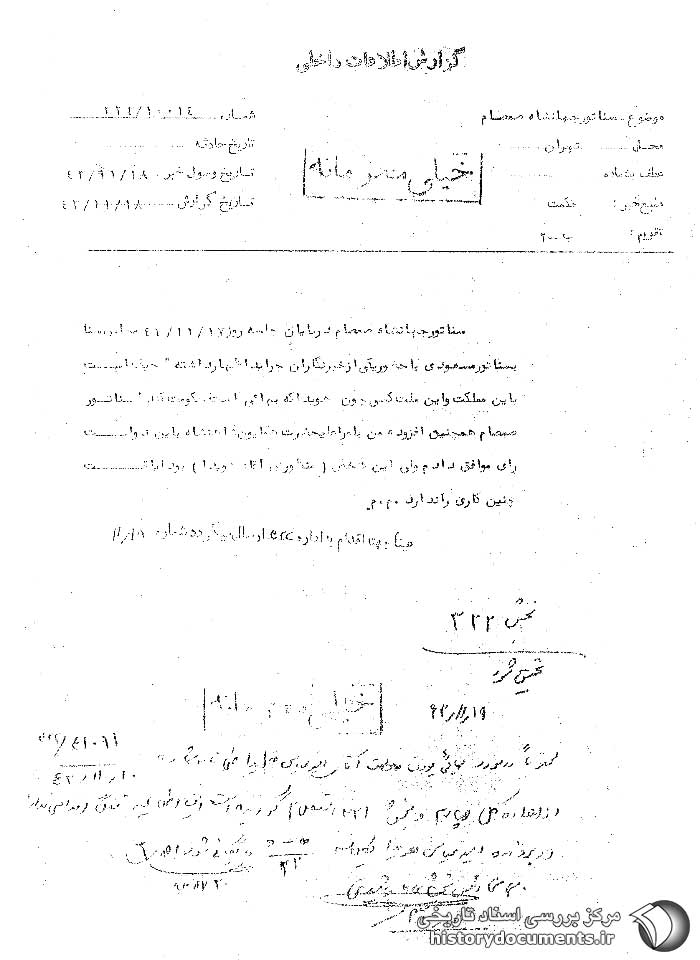 محترماً در مورد بهائی بودن آقای امیرعباس هویدا طی نامه شماره 41091 / 322 مورخ 20 / 11 / 43 از اداره کل چهارم و بخش 321 استعلام گردیده است. این اطلاعیه فعلاً اقدامی ندارد. در پرونده امیرعباس هویدا به کلاسه هـ و / 22 بایگانی شود.