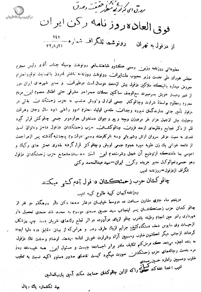 تلگراف مدیر روزنامه رکن ایران در مورد اقدامات حزب زحمتکشان در دزفول.