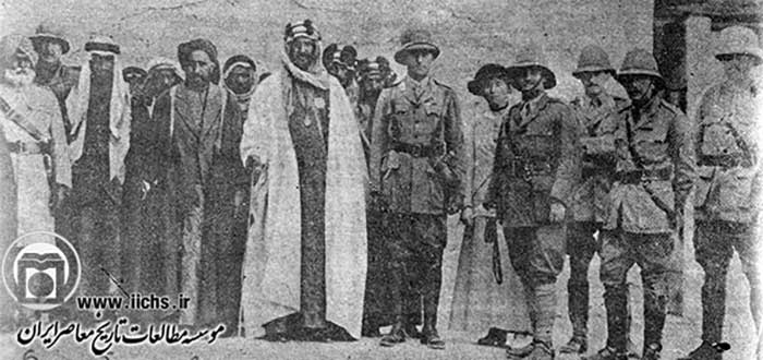 شیخ خزعل به اتفاق امیرعبدالعزیز آل سعود و چند تن از افسران انگلیسی در کویت (1916م).