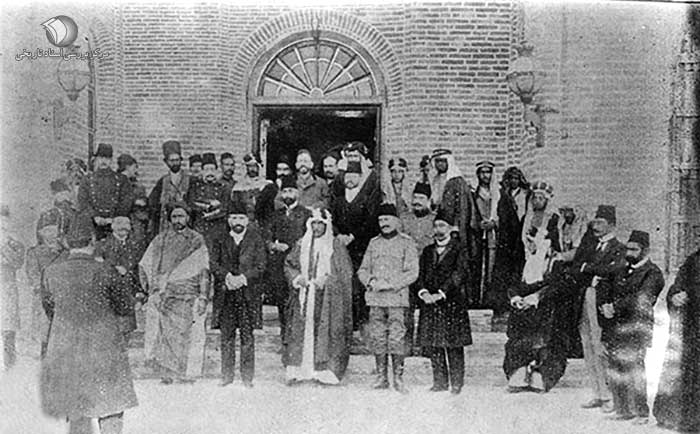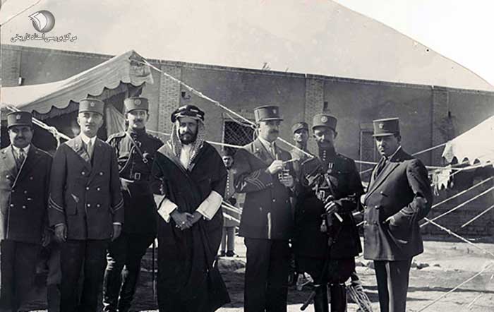 شیخ خزعل به اتفاق جمعی از افسران و مقامات کشورهای عربی و عثمانی.