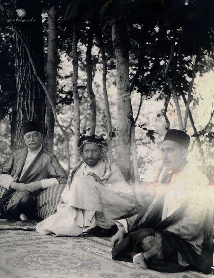 عبدالحسین تیمورتاش وزیر دربار، به اتفاق شیخ خزعل و عدهای از مقامات وزارت دربار.