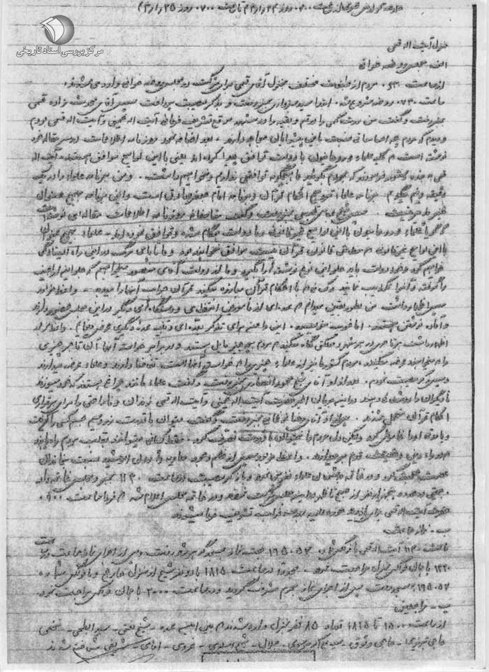 ساعت 11:30 آیتالله قمی با فولکس شماره 195057جهت نماز، [به] مسجد گوهرشاد رفت و پس از اجرای نماز جماعت، در ساعت 12:20 با همان فولکس به منزل مراجعت نمود. مجدداً در ساعت 18:15 با دو نفر شیخ از منزل خارج و با فولکس شماره 195057 به مسجد رفت و پس از اجرای نماز به حرم مشرف گردید و در ساعت 20:00 با همان فولکس مراجعت نمود.