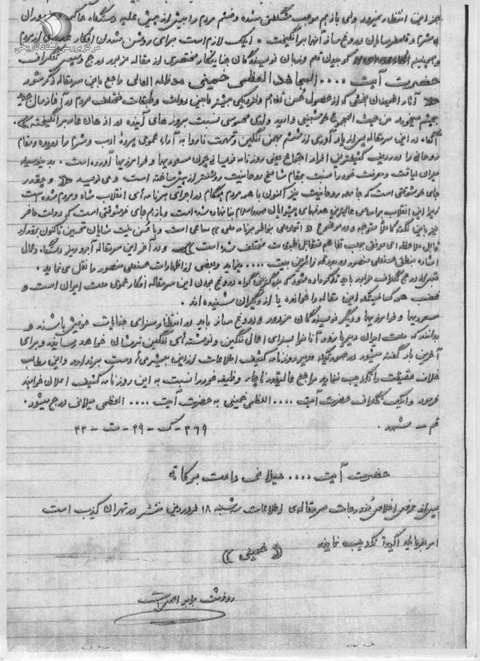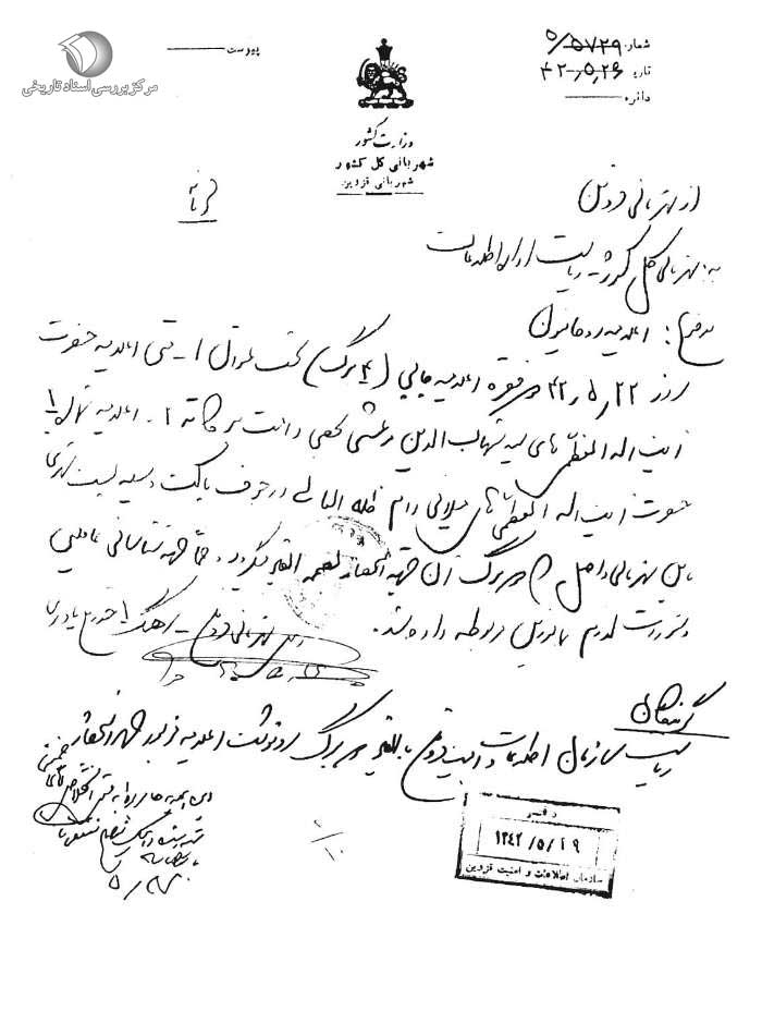ریاست سازمان اطلاعات و امنیت قزوین با ایفاد دو برگ رونوشت اعلامیه مزبور جهت استحضار؛ این اعلامیهها مربوط به قبل از استخلاص آقای خمینی تهیه شده و اینک موضوع منتفی است. 27 / 5 / 42