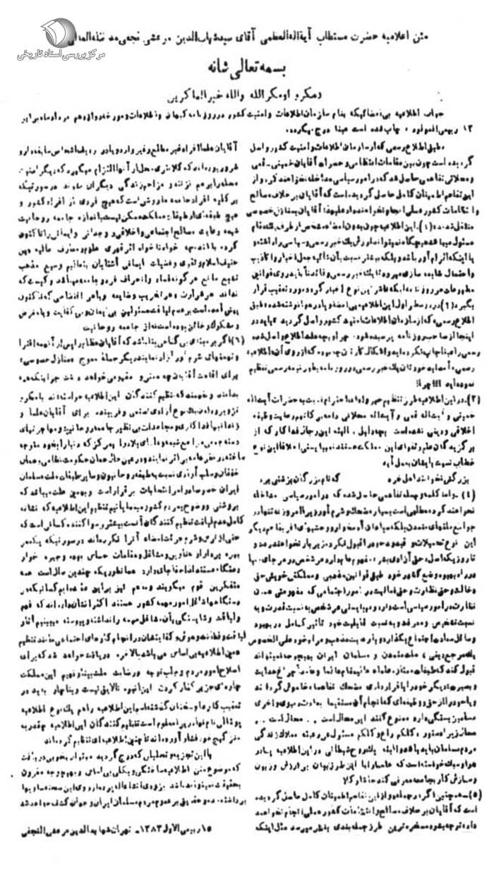 1- متن اعلامیه حضرت آیتالله العظمی سید شهابالدین مرعشی نجفی دامت برکاته
