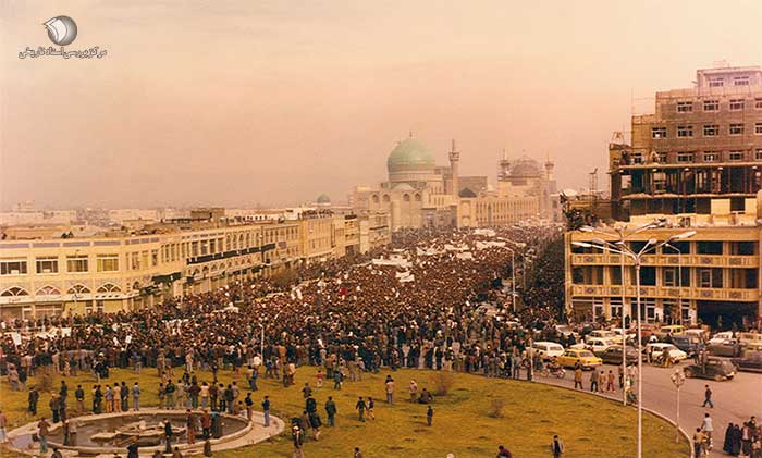 «راهپیماییها تا روز تاسوعا ادامه داشت. در این روز حوادث گوناگونی در مشهد رخ داد که بعضاً تازگی داشت. از آن جمله بود سقوط پیاپی مجسمههای رضا و محمدرضا پهلوی و خوانده شدن خطبه شب عاشورا به نام امام خمینی. ساعت سه بعدازظهر تاسوعا بود که شماری از مردم عکسهای شاه را از صحن پهلوی پایین کشیده، پاره کردند. دقایقی بعد کاشیها و ستونهای یاد بود حرم از اسم شخص اول زدوده شد. ساعت 5:30 بعدازظهر مجسمه رضاپهلوی از میدان شاه پایین کشیده شد. این رویداد در میدان تقیآباد و بیمارستان شاهرضا هم رخ داد.