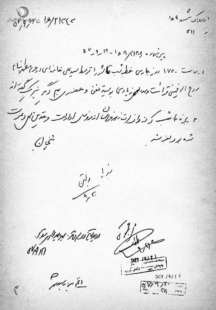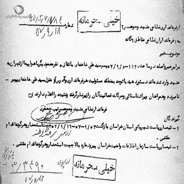 برابر خبر واصله در ساعت 11:30-8 / 9 / 57 پسر سیدعلی خامنهای به اتفاق 5 نفر معمم دیگر با هواپیما از تهران به مشهد وارد شدهاند. دستور دهید با توجه به منطقه مسئولیت هر فرمانداری و آدرس منزل سیدعلی خامنهای پسر نامبرده و همراهان وی را شناسایی و حرکات فعالیت آنان را زیر نظر گرفته و نتیجه را اعلام دارند.