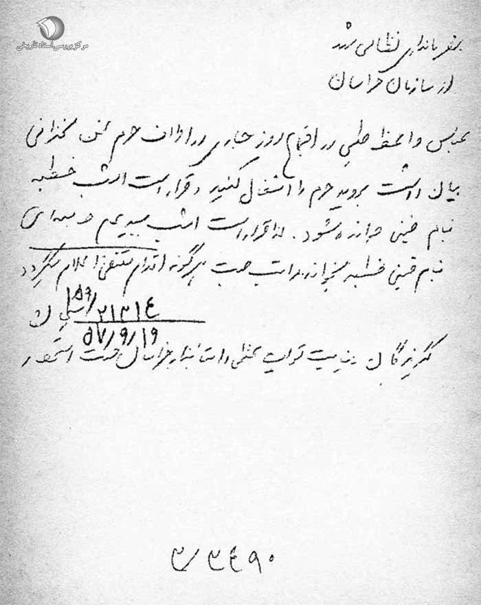 نیابت تولیت عظمی و استاندار خراسان جهت استحضار.