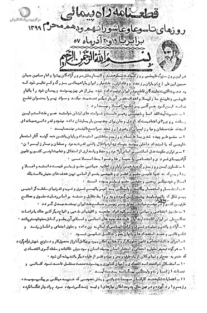 در این روز بزرگ تاریخی، روز شهادت شکوهمند و الهام بخش سرور آزادگان، پیشوا و امام مسلمین جهان حسین بن علی(ع) و یاران رزمنده و وفادارش، ملت مبارز ایران با راهپیمایی بزرگ و کمنظیر خود که به دعوت نمایندگان اکثریت قاطع مردم ایران ترتیب داده شده، بیش از هر چیز پیوند و پیمان خود را با قیام تاریخی و تاریخساز کربلا و اهداف مقدس آن بار دیگر تجدید میکند و مواد زیر را به عنوان قطعنامه این گرد همآیی پر شکوه اعلام میدارد: