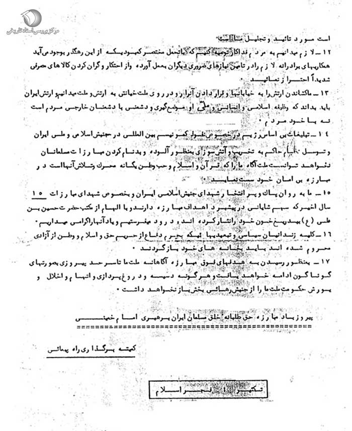 14. تبلیغات بیاساس رژیم در خصوص نفوذ کمونیسم بینالمللی در جنبش اسلامی و ملی ایران و توسل نظام حاکم به تخریب و آتشسوزی بهمنظور آلوده و بدنام کردن مبارزات مسلمانان نخواهد توانست ملت آگاه ما را که قرآن و اسلام و حبّ وطن، یگانه محرّک و تلاش آنها است، در مبارزه بیامان خود سست نماید.