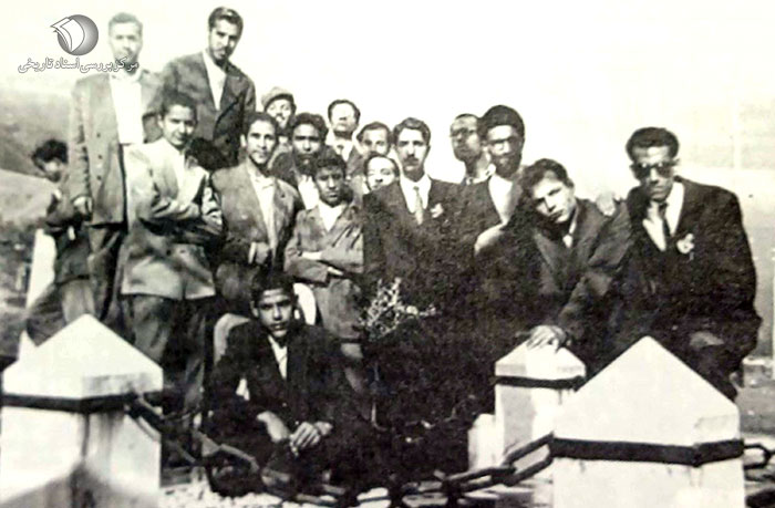نخشب (نفر ششم) به همراه آیتالله سید محمود طالقانی (نفر سوم) بر سر مزار محمد مسعود. خردادماه 1328