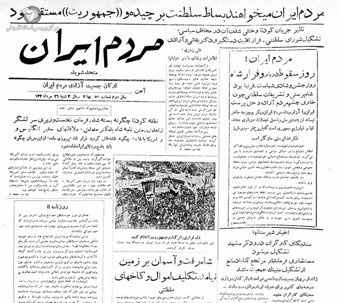 [39] نشریه مردم ایران، ستون «مردم ایران!»، سال دوم، شماره 57، شنبه 26 مرداد 1332، ص 1.