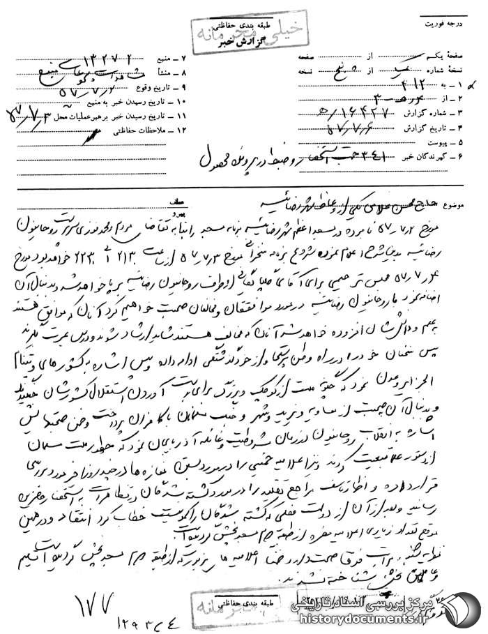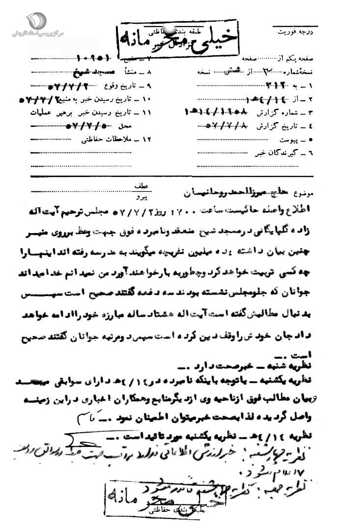 5ـ بعد از اتمام سخنرانی واعظ حسنی تعدادی اعلامیه مضره پخش گردیده است.»[39]