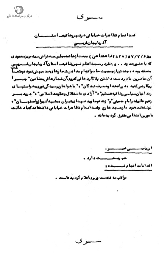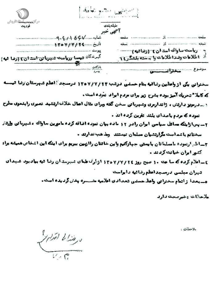 4ـ اعلام کرده که ساعت 10 صبح روز 24 /7 /1357 از طرف علمای شهرستان رضائیه (ارومیه) به یادبود شهدای تهران مجلسی در مسجد اعظم رضائیه دایر است.