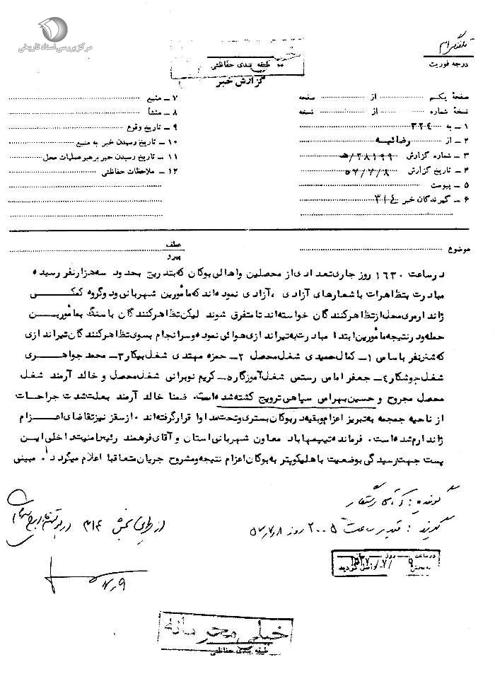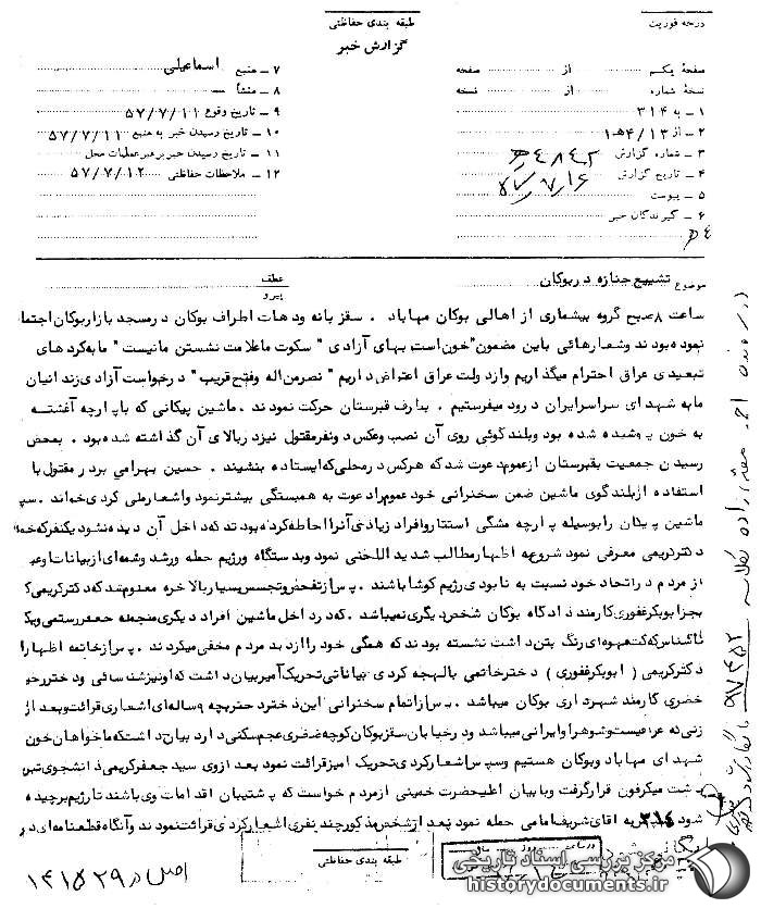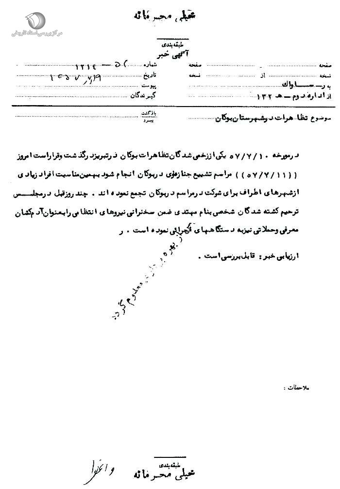 گزارش ساواک از تجمع مردم شهرهای اطراف بوکان برای تشییع جنازه یکی از قربانیان این شهر.