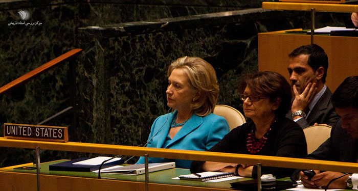 ولیرضا نصر در کنار هیلاری کلینتون وزیر خارجه آمریکا در مجمع عمومی سازمان ملل، 2012م. / 1391ش.