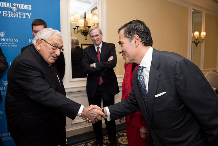 استقبال ولیرضا نصر از هنری کیسینجر در مراسم افتتاحیه مرکز هِنری ای کیسینجر برای امور جهانی، 6 اکتبر 2016 / 15 مهر 1395.