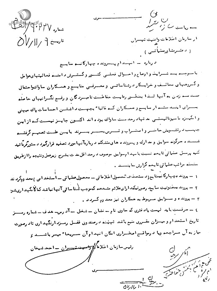 باتوجه به شرایط و اوضاع و احوال فعلى کشور و گسترش دامنه فعالیتهاى عوامل و گروههاى مخالف و خرابکار در شناسایى و معرفى منابع و همکاران ساواک و احتمال صدمه زدن به آنها لذا به منظور رعایت حفاظت نامبردگان و رفع نگرانىهاى حاصله براى این دسته از منابع و همکاران که غالباً به جهت داشتن احساسات پاک میهنى و انگیزه ناسیونالیستى مدتها در خدمت ساواک بودهاند اکنون جایز نیست که از این جهت در تشویش خاطر و اضطراب و ترس به سر برند به این علت تصمیم گرفته شده هرگونه سوابق و مدارک و پروندههاى متشکله درباره آنها مورد تصفیه قرار گیرد دستور فرمایید کلیه پرسنل عملیاتى تابعه نسبت به انهدام سوابق موصوف در حداقل مدت به شرح زیر عمل و نتیجه را از طریق سلسله مراتب عملیاتى تابعه گزارش نمایند.