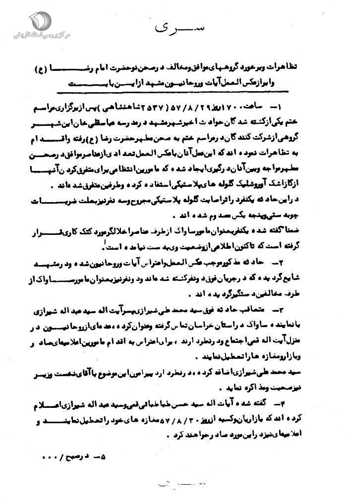 [6]. در اسناد ساواک در مورد حادثه مشهد آمده است: «ساعت 1700 روز 29 /8 /57 (2537 شاهنشاهی) پس از برگزاری مراسم ختم یکی از کشتهشدگان حوادث اخیر شهر مشهد در مدرسه عباسقلی خان این شهر، گروهی از شرکتکنندگان در مراسم ختم به صحن مطهر حضرت رضا(ع) رفته و اقدام به تظاهرات نمودهاند که این عمل آنان با عکسالعمل تعدادی از عناصر موافق در صحن مطهر مواجه و بین آنان درگیری ایجاد شده که مأمورین انتظامی برای متفرقکردن آنها از گاز اشکآور و شلیک گلوله پلاستیکی استفاده کرده و طرفین متفرق شدهاند. در این حادثه یک نفر در اثر اصابت گلوله پلاستیکی مجروح و سه نفر نیز بهعلت ضربات چوبدستی و پنجه بکس مصدوم شدهاند. ضمناً گفته شده یک نفر بهعنوان مأمور ساواک از طرف عناصر اخلالگر مورد کتککاری قرار گرفته است که تاکنون اطلاعی از وضعیت وی بدست نیامده است. ... حادثه مذکور موجب عکسالعمل و اعتراض آیات و روحانیون شده و در مشهد شایع گردیده که در جریان فوق دو نفر کشته شدهاند و دو نفر نیز بهعنوان مأمور ساواک از طرف مخالفین دستگیر گردیدهاند. ... متعاقب حادثه فوق آیتالله سید محمدعلی شیرازی پسر آیتالله سید عبدالله شیرازی با نماینده ساواک در استان خراسان تماس گرفته و عنوان کرده، عده ای از روحانیون در منزل آیتالله سید حسن قمی اجتماع و در نظر دارند، برای اعتراض به اقدام مأمورین اعلامیهای صادر و بازار و مغازهها را تعطیل نمایند. سید محمدعلی شیرازی اضافه کرده، در نظر دارد پیرامون این موضوع با آقای نخست وزیر نیز صحبت و مذاکره نماید. گفته شده آیتالله سید حسن طباطبائی قمی و آیتالله سید عبدالله شیرازی اعلام کردهاند که بازاریان و کسبه از روز 30 /8 /57 مغازههای خود را تعطیل نمایند و اعلامیهای نیز در این مورد صادر خواهند کرد.» (نک به: سند شماره 3، پیوست در همین مقاله).